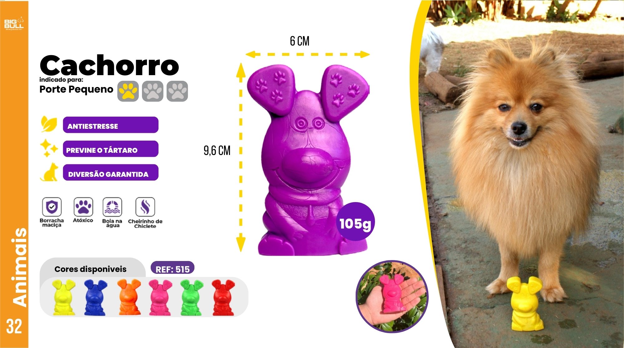 - Aparência: Formato de cachorrinho com design lúdico e acabamento colorido para alto apelo visual no ponto de venda.